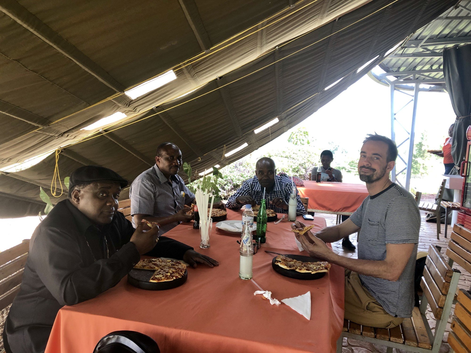SAYING GOODBYE TO KARAGWEBruce and I left Karagwe after settling up bills, emotional goodbyes and some last minute photos.Jan and Accurate, Karagwe Hotel ManagerBishop Bagonza took his personal time to accompany Bruce and I to Kigali. Bishop is a spiritual leader who is recognized globally as a national and community organizer; an advocate for the marginalized; a servant leader who is known to shelter the persecuted, help provide for those in need; and organize, speak and publish on behalf of the people of Tanzania. He graced us with his presence on this trip and we were grateful.En route to Kigali we enjoyed pizza at the WOC, compliments of the one who designed and was PM for the project.Dr Bagonza was able to see the WOC.Bishop, Dustin and I said goodbye to Bruce who will stay in Kigali and then I was dropped off at the airport. I’m on my way home via Entebbe and Amsterdam.What a great trip.